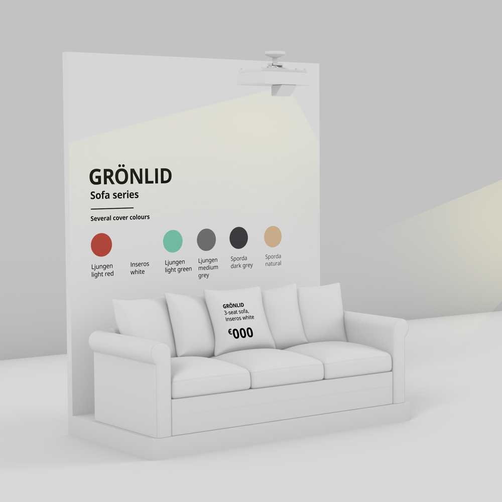 Digital content to be projected on the sofa solution. Content will display the variety of available covers, and the hidden benefits, for example: removable covers, guarantee and price. Secure the placement of fabric samples close to the solution, to make sure customers can touch and feel the real fabric and see the real colours.
