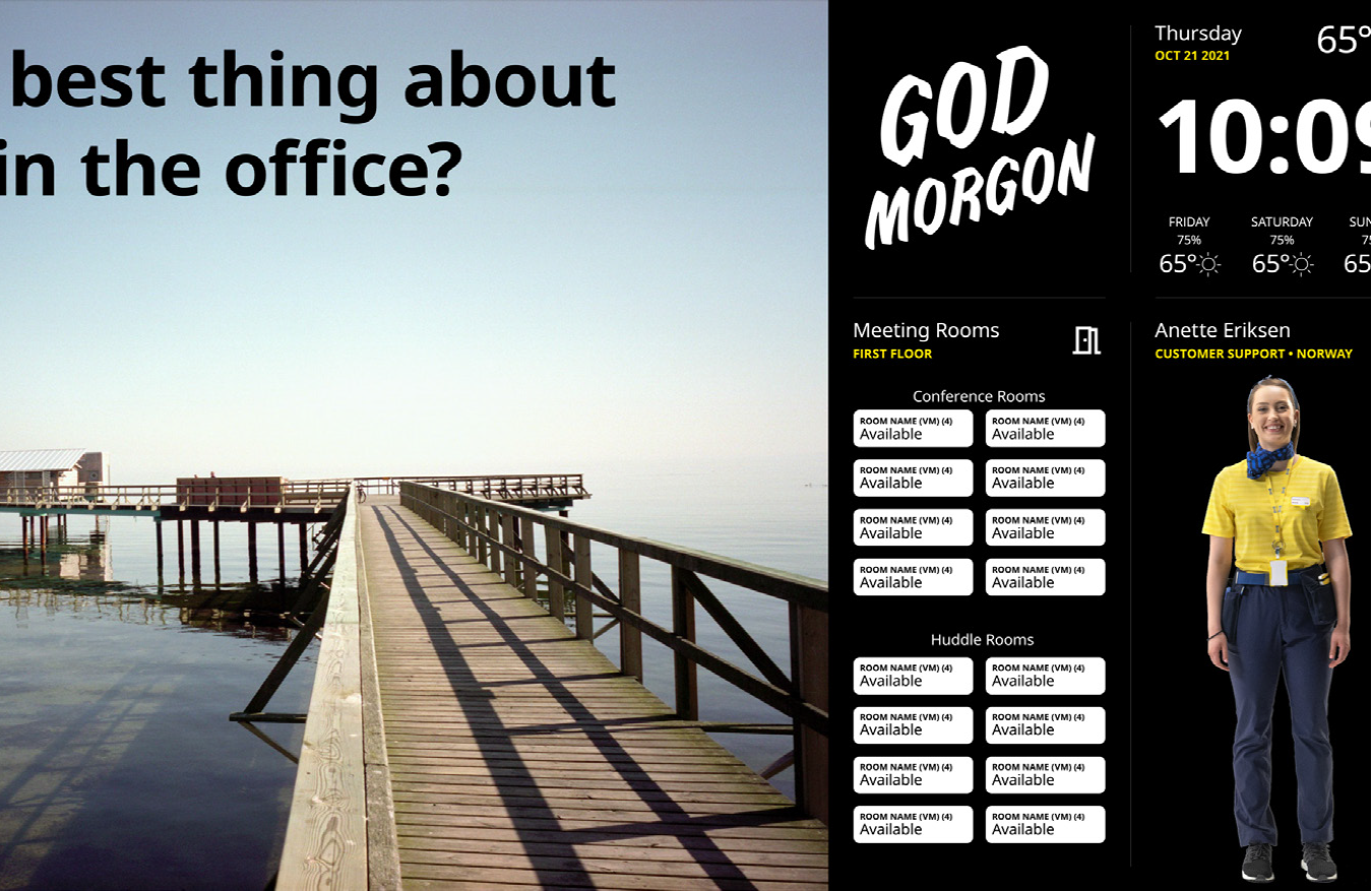• Dayparted messages, enabling employees and guests to easily consume what they need based on their current activities. Morning featuring meeting room availability, lunchtime focusing on gamification and afternoon displaying travel and weather updates.