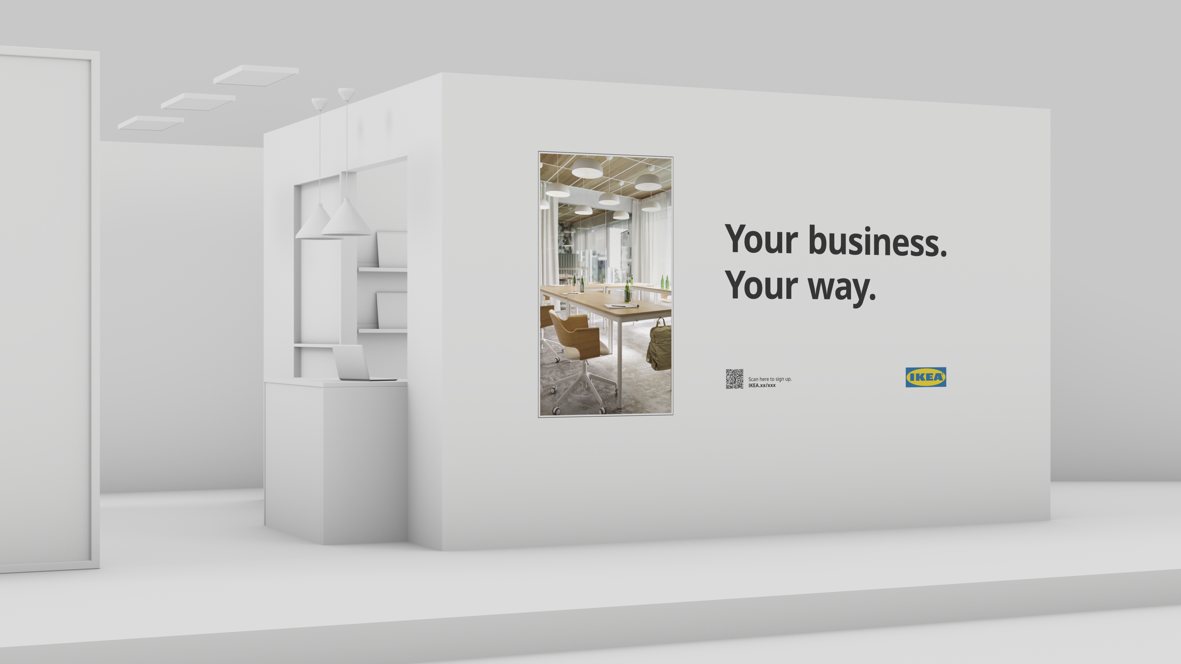 A facade display promoting IKEA for Business, showcasing products and services while driving engagement through the “Your business. Your way.” message and QR sign-up.
