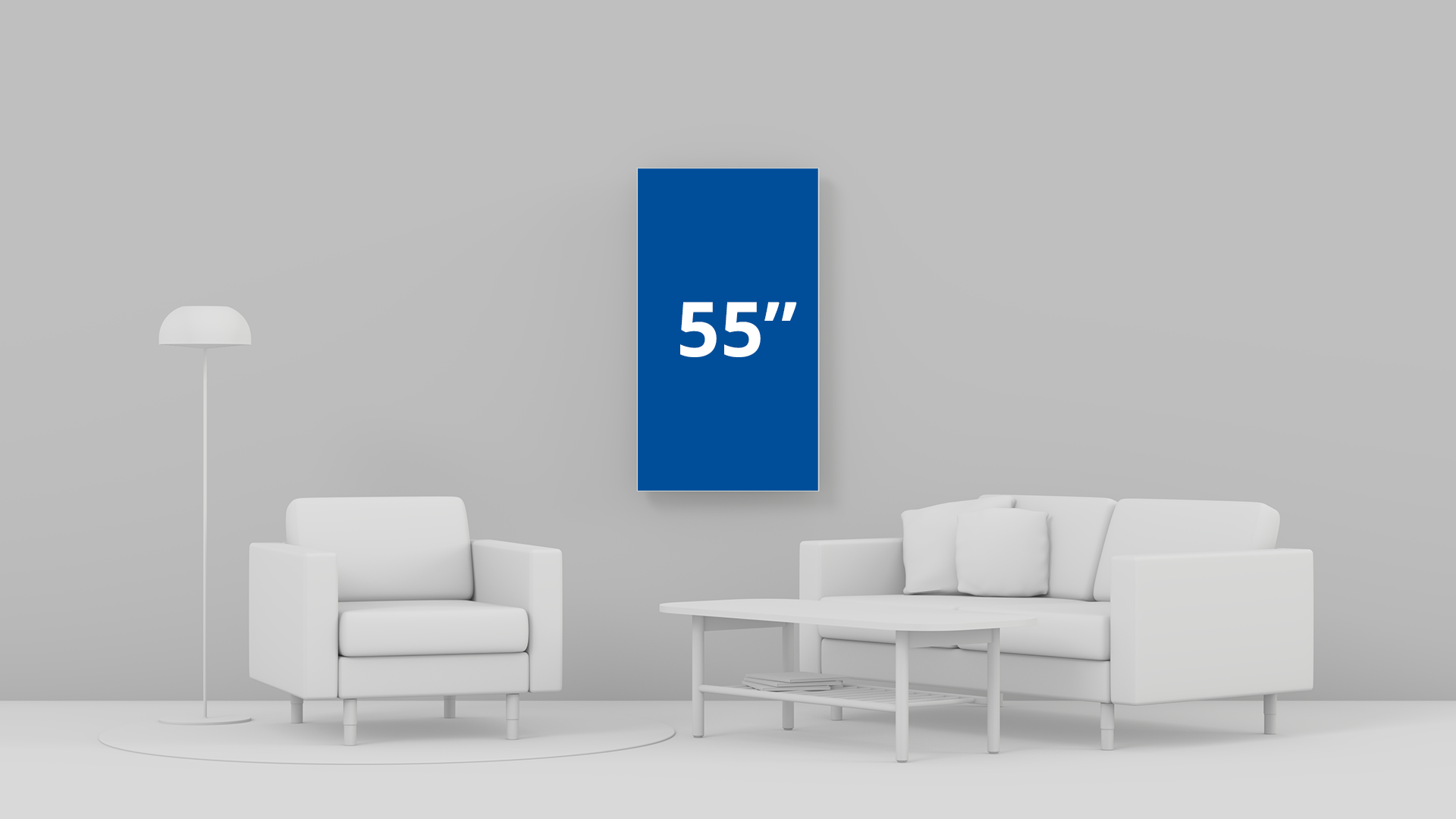 A 55″ display installed in a portrait mode. The wall needs to be prepared to hold the weight of the screen. We recommend the screen to be installed high enough to avoid damage from shopping carts.