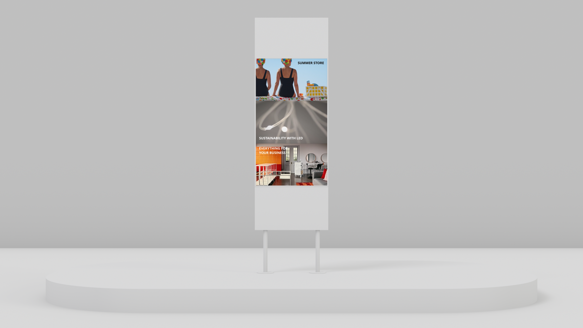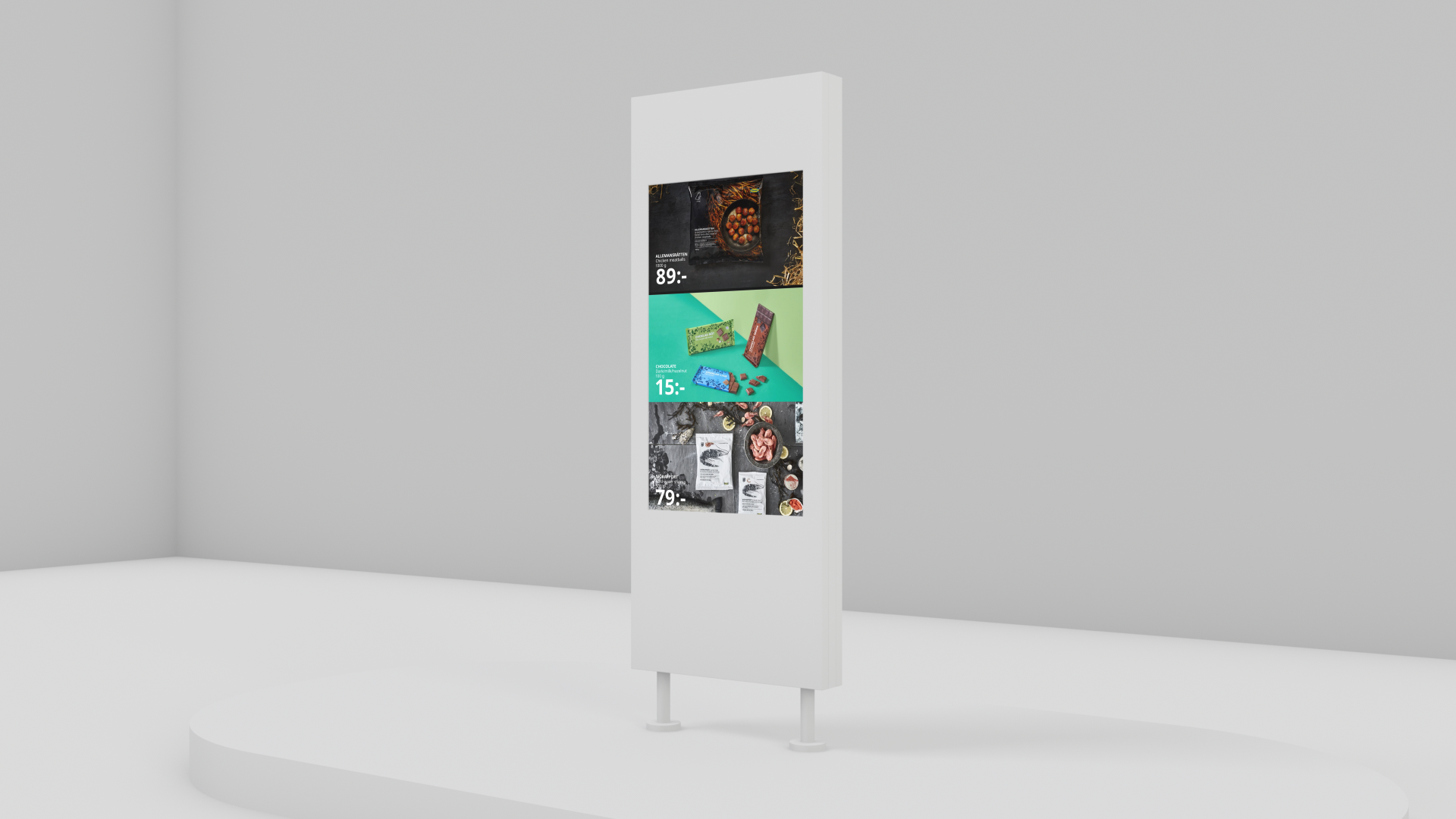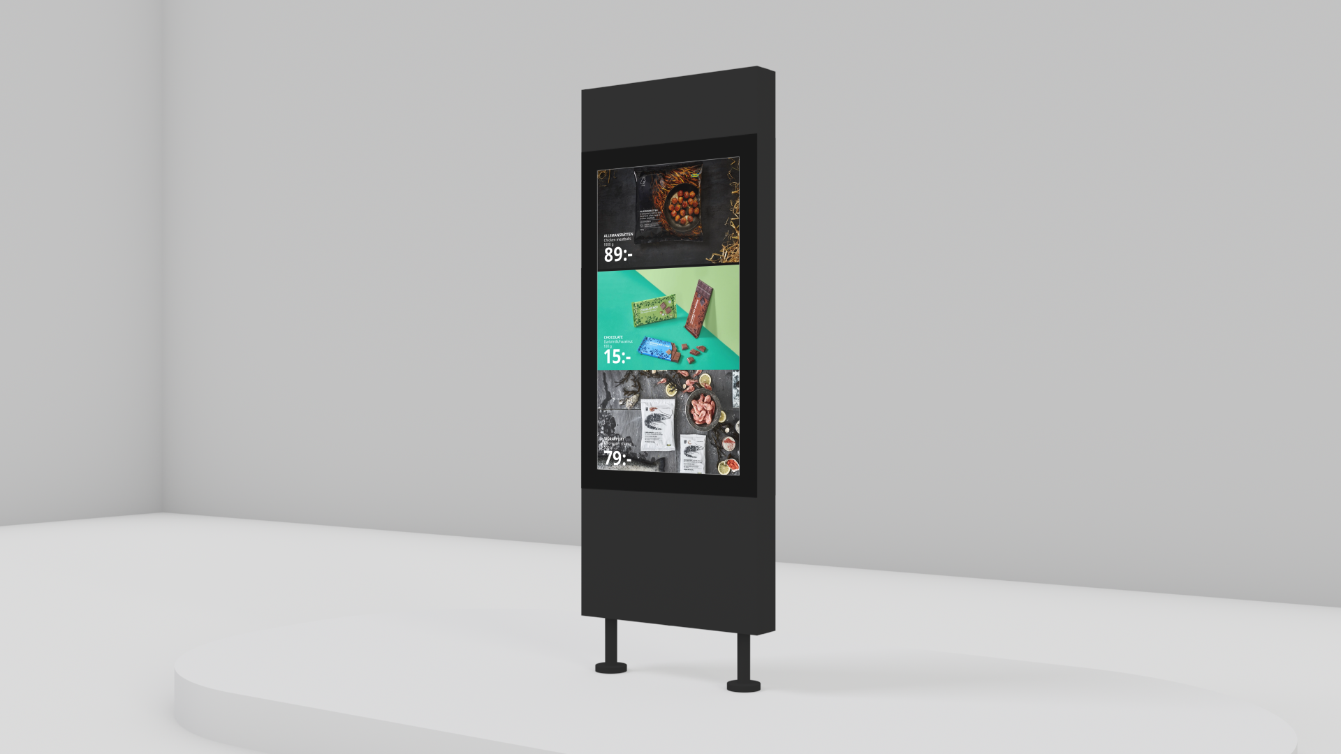 One 55″ 4K screen in portrait mode mounted into a metal totem. The totem has ventilation built-in and LAN and power cables can be installed from above or below.